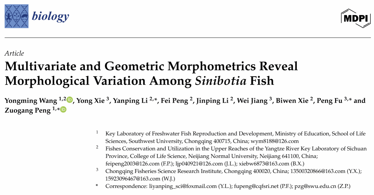 2025年9月2日,重点实验室成员王永明副教授(第一作者)、李燕平副教授(共同通讯作者)和谢碧文教授联合西南大学与重庆市水产科学研究所在中国科公司SCI二区杂志《Biology》上发表一篇题为《Multivariate and Geometric Morphometrics Reveal Morphological Variation Among Sinibotia Fish》的研究论文。